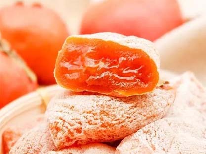 十天左右果肉开始皱缩进行第一次捏饼以后每隔两至三天捏饼一次,如此反复,柿饼才会变得外韧内软,经一月有余,柿饼渐成,柿霜自然析出,白如霜雪,味甜清凉,可入药,肺热燥咳,咽干喉痛者,食之有益。