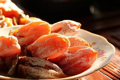 吊柿饼是陕西富平县的名小吃,主要使用富平大尖柿子为原材料制作。自古富平就是柿子的优质生产区,富平县位于陕西省中部,地处关中平原、陕北高原的过渡地带,四季干湿冷暖分明,很适合柿子的生长。