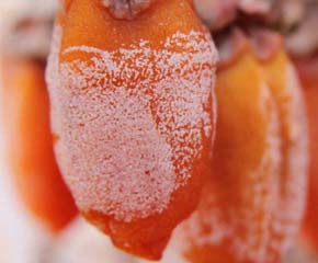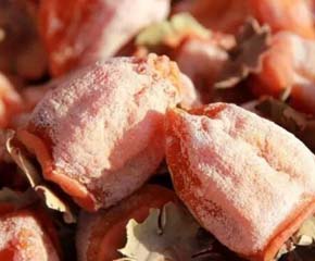 富平柿饼的柿霜是不均匀的一粒一粒的,不像面粉均匀细致,是从柿子里面蒸发出来的果糖,好多人都以为是涂抹上的,富平柿饼的霜遇热会有点融化,天越冷,霜越厚,柿饼就越好。富平柿饼霜治疗顽固性口腔溃疡,富平柿饼入口即化,甜而不腻,霜已经化了的柿饼放在阴冷的地方或者冰箱里还可以再生长出来柿霜。
